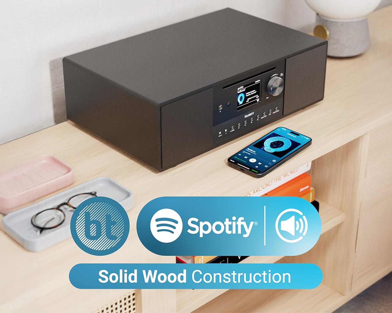 The MAJORITY Quadriga is one of the most capable all-in-one music systems you can buy without entering premium Hi-Fi territory. It combines a CD player, DAB and FM radio, internet radio, Bluetooth streaming, Spotify Connect, USB playback, AUX and optical input, plus a 120-watt 2.1 speaker system inside a single compact unit.